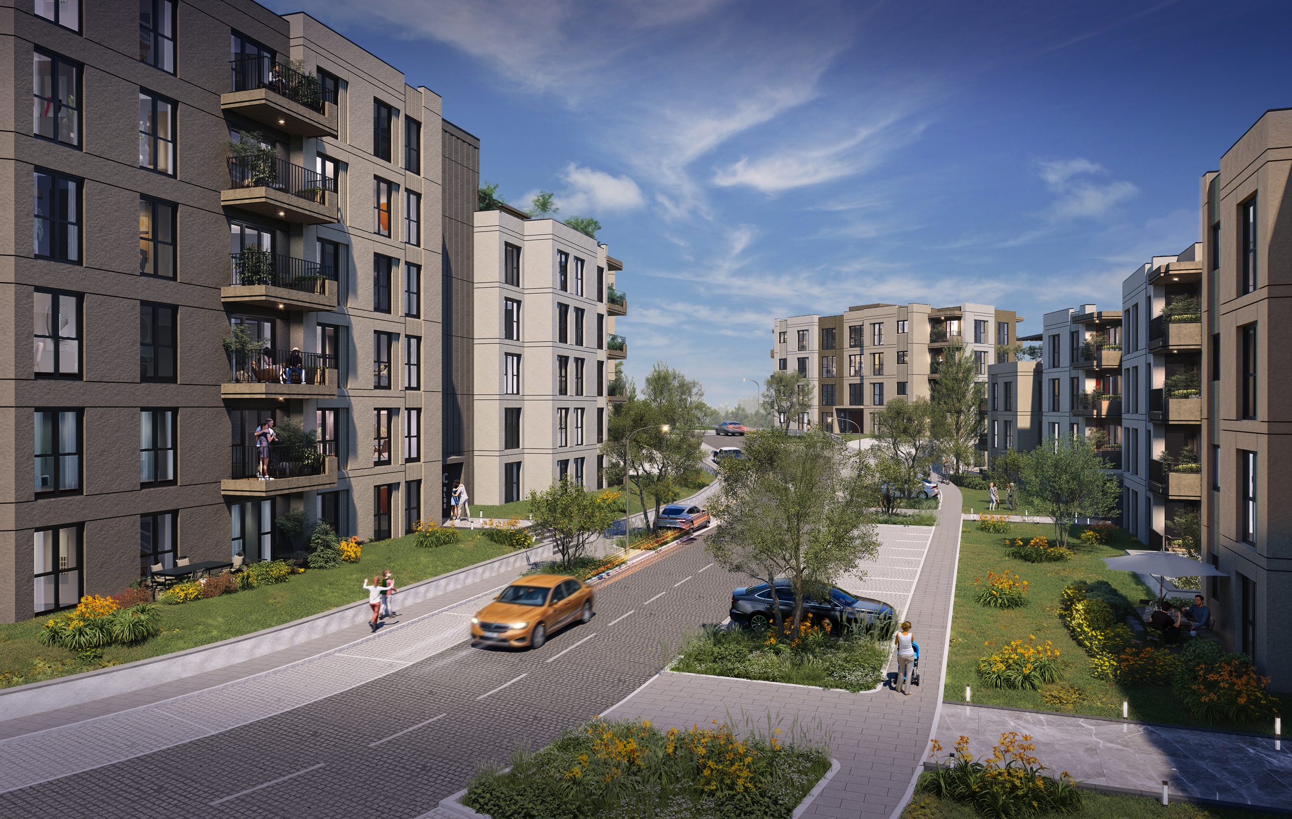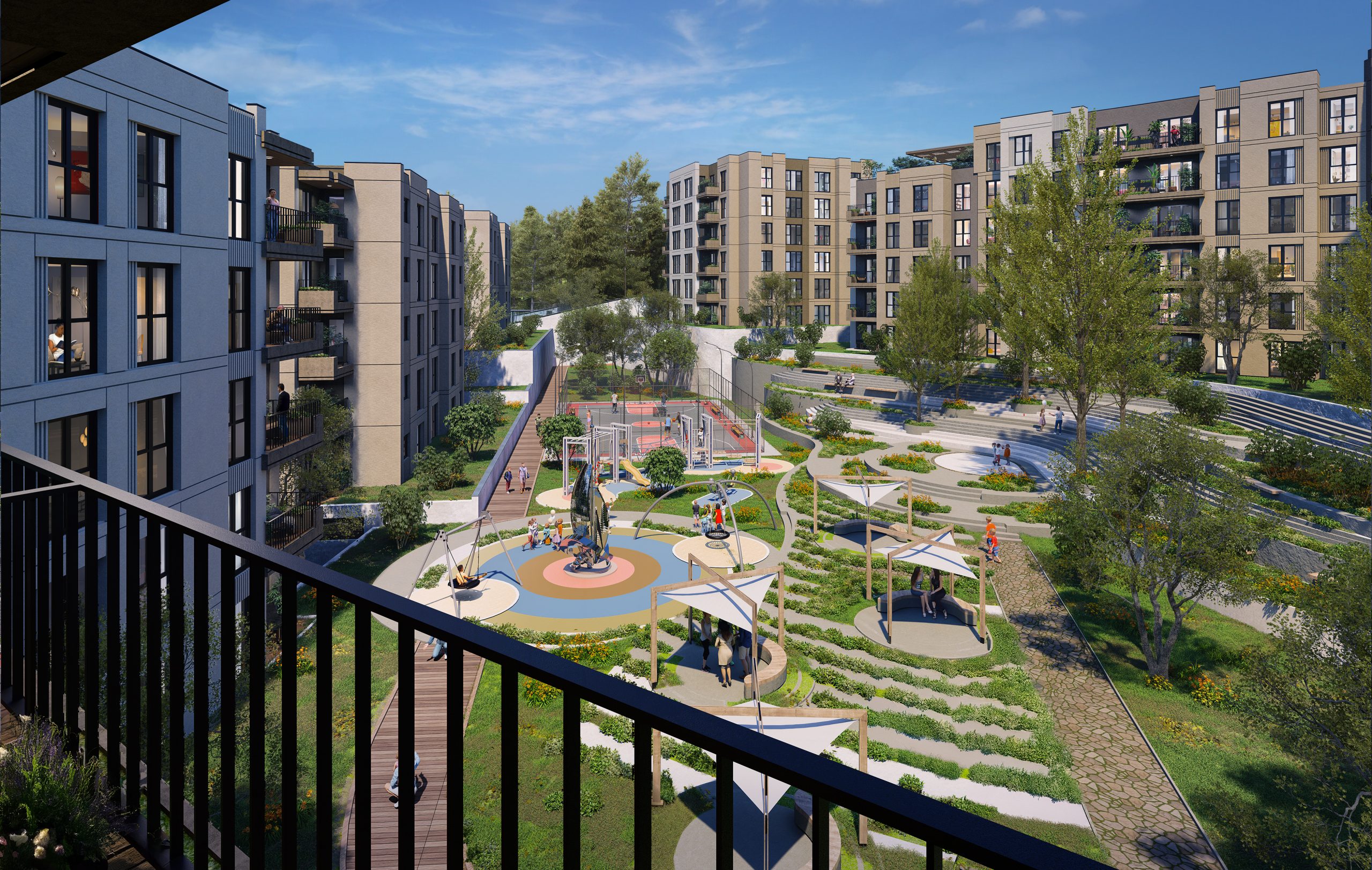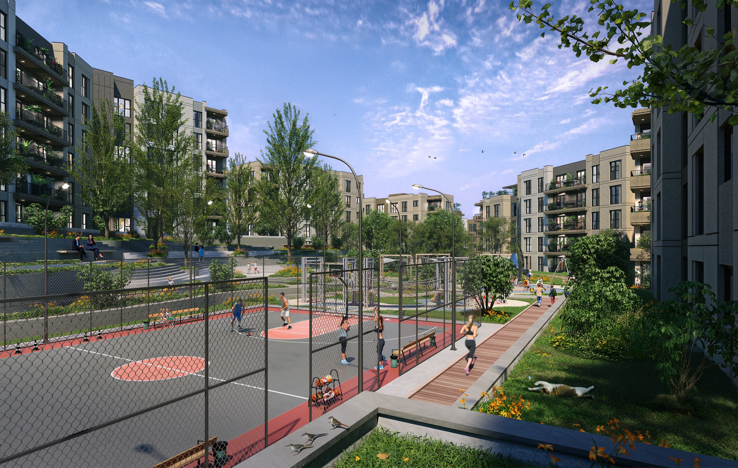 Zemin kotunda peyzaj ve sert zemin ilişkisi; bina girişlerini tarifleyen, yürüyüşü yönlendiren ve sosyal alanlara bağlanan bir süreklilik kuruyor. Bu kurgu, etap genelindeki kamusal odaklarla birleşerek; yatay mimari anlayışını yalnızca kat sayısı değil, günlük yaşam kalitesi üzerinden görünür kılıyor.