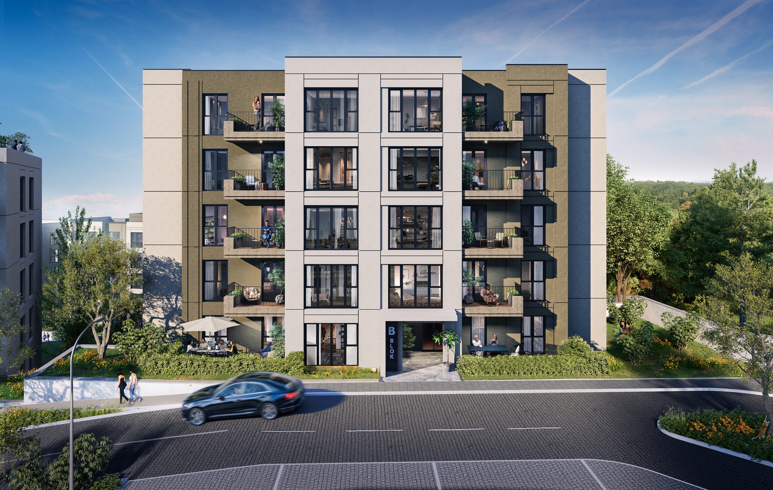 Sokak cephesinde amaç; tek bir “uzun kütle” etkisi yerine, parçalı ve ritimli bir siluet üretmekti. Cephelerdeki düşey-vurgular, balkon geri çekilmeleri ve açıklık düzeni; yürüyen kullanıcı için ölçeği küçülten, yaşama yakın bir tempo kuruyor. Böylece konutlar, yalnızca bir kütle kompozisyonu değil; adres duygusu üreten bir sokak yüzeyi haline geliyor.
