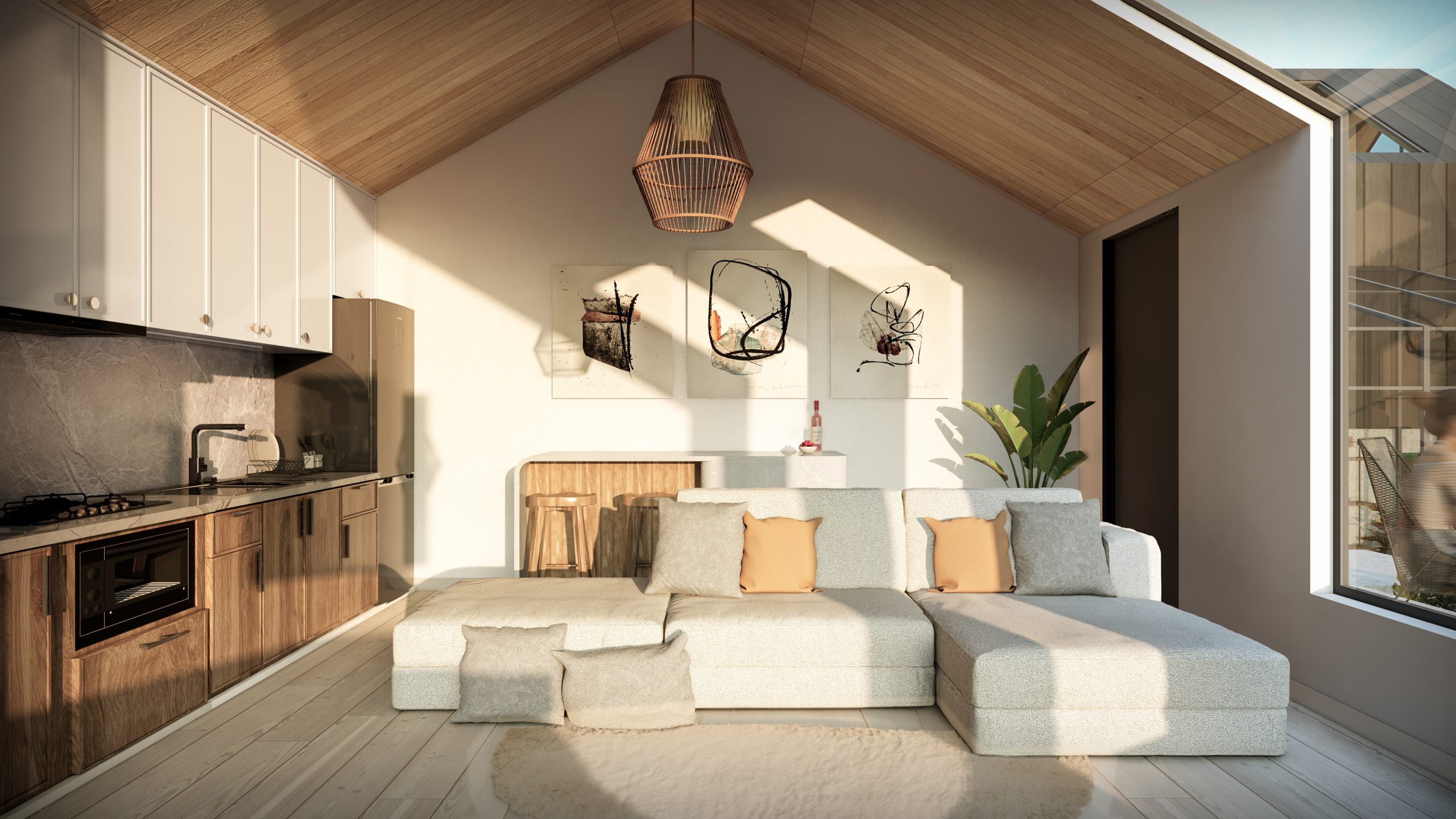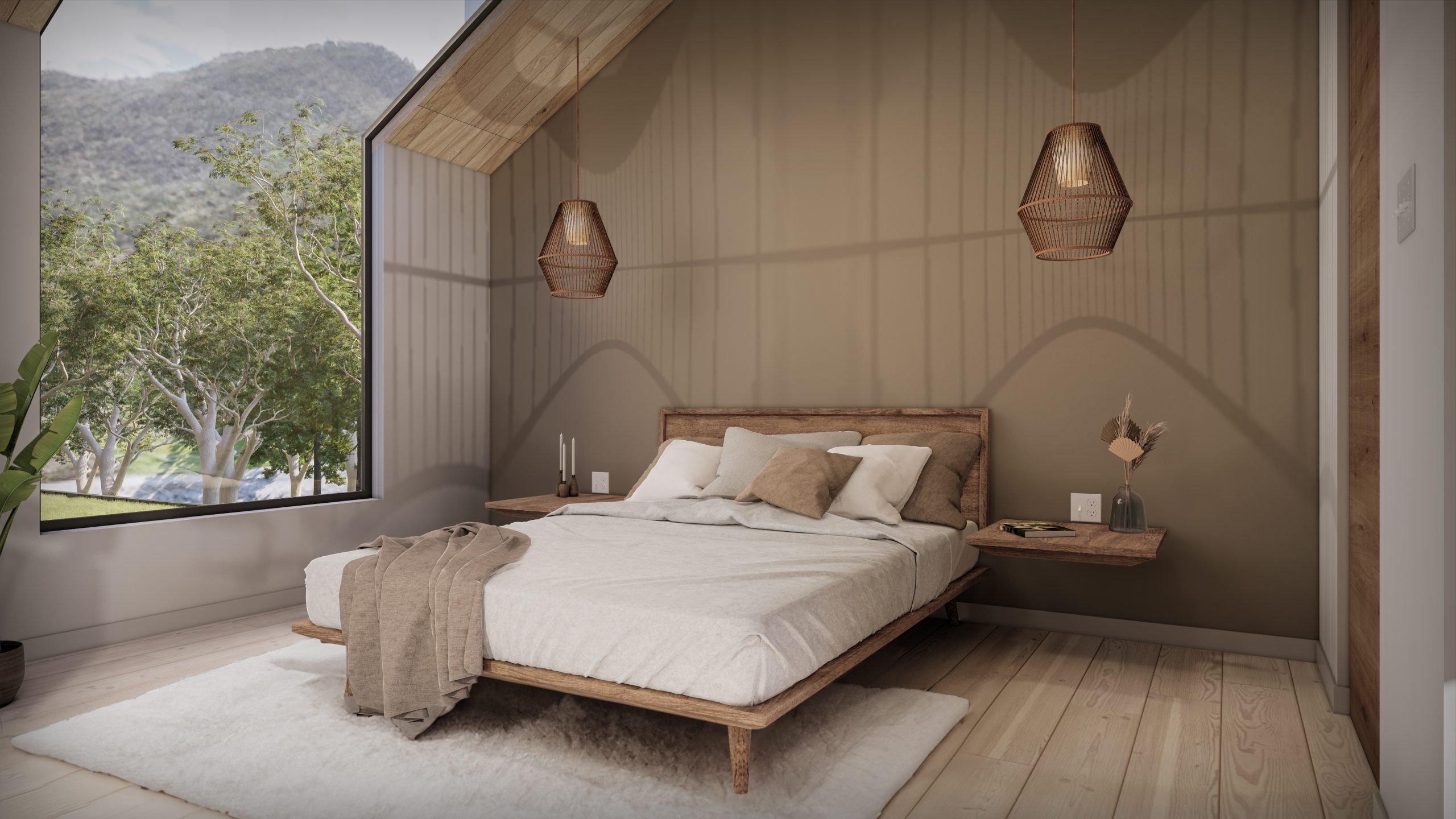 Bu tasarımın amacı, şehir yaşamından kaçmak isteyen Airbnb kullanıcılarına konforlu ve sade bir konaklama deneyimi sunmaktır. Her iki mekanda da doğayla bütünleşme ve huzur duygusu ön planda tutularak, kullanıcıların rahatlamasına ve dinlenmesine olanak sağlayacak bir yaşam alanı yaratılmıştır.
