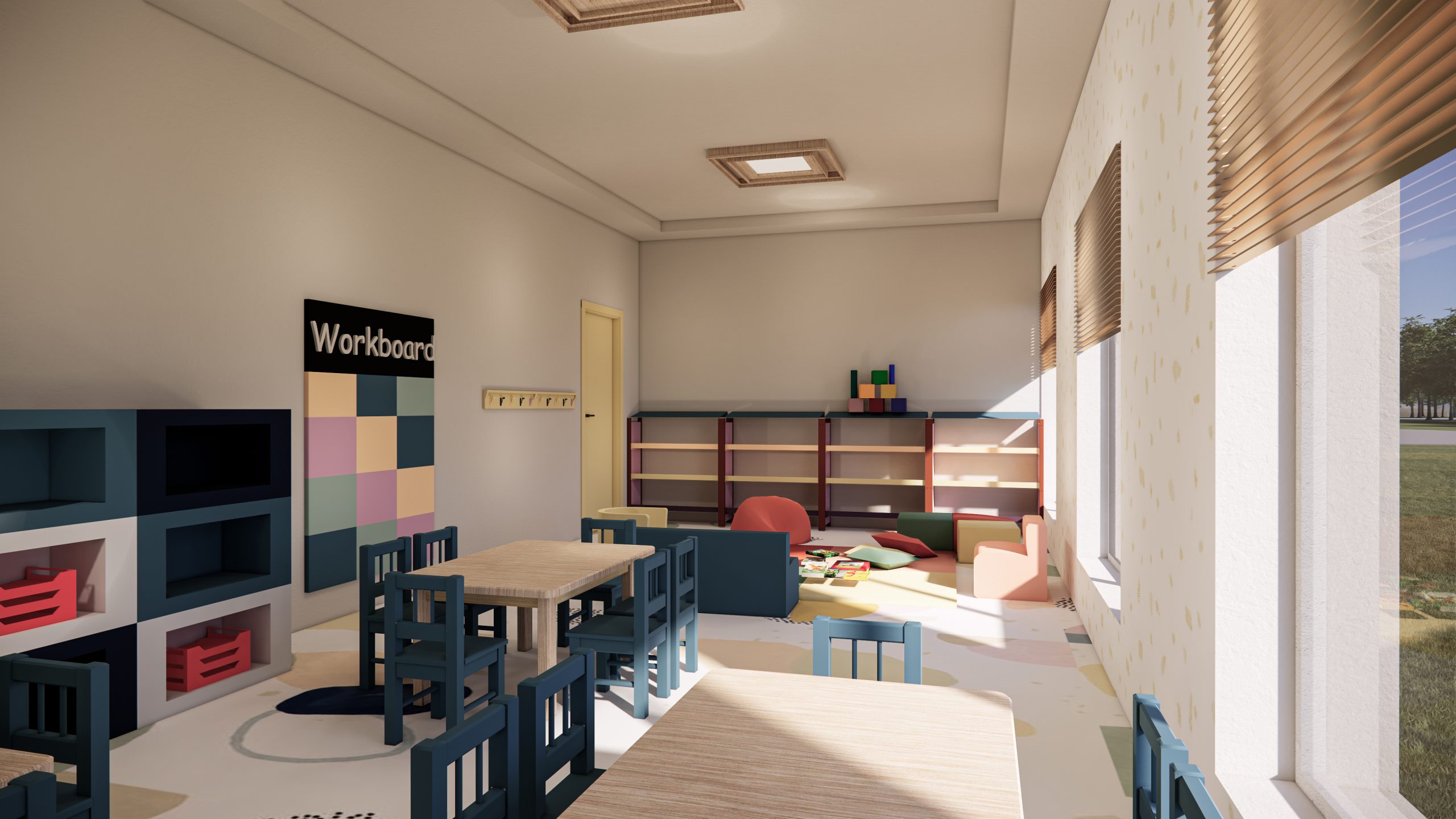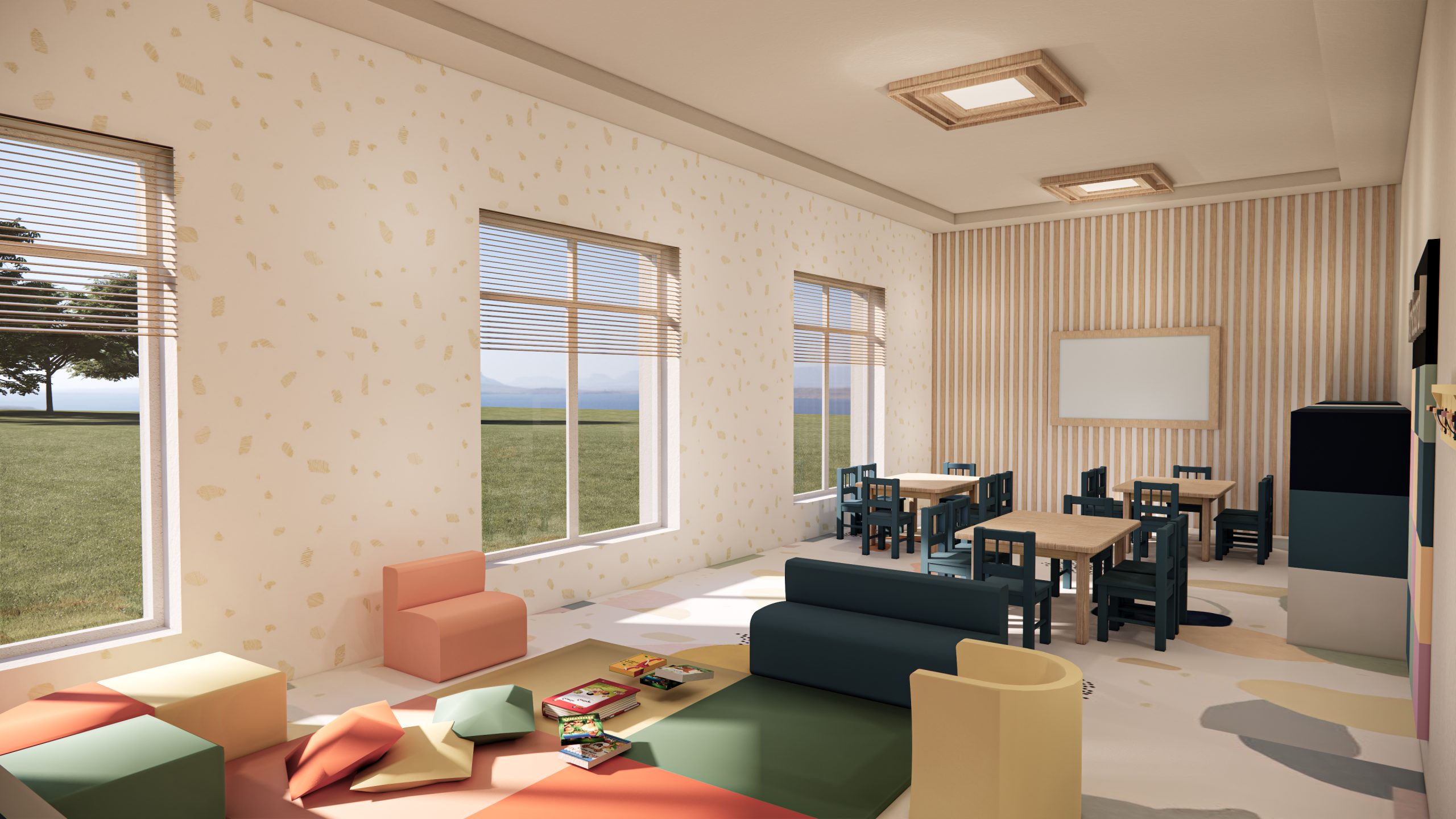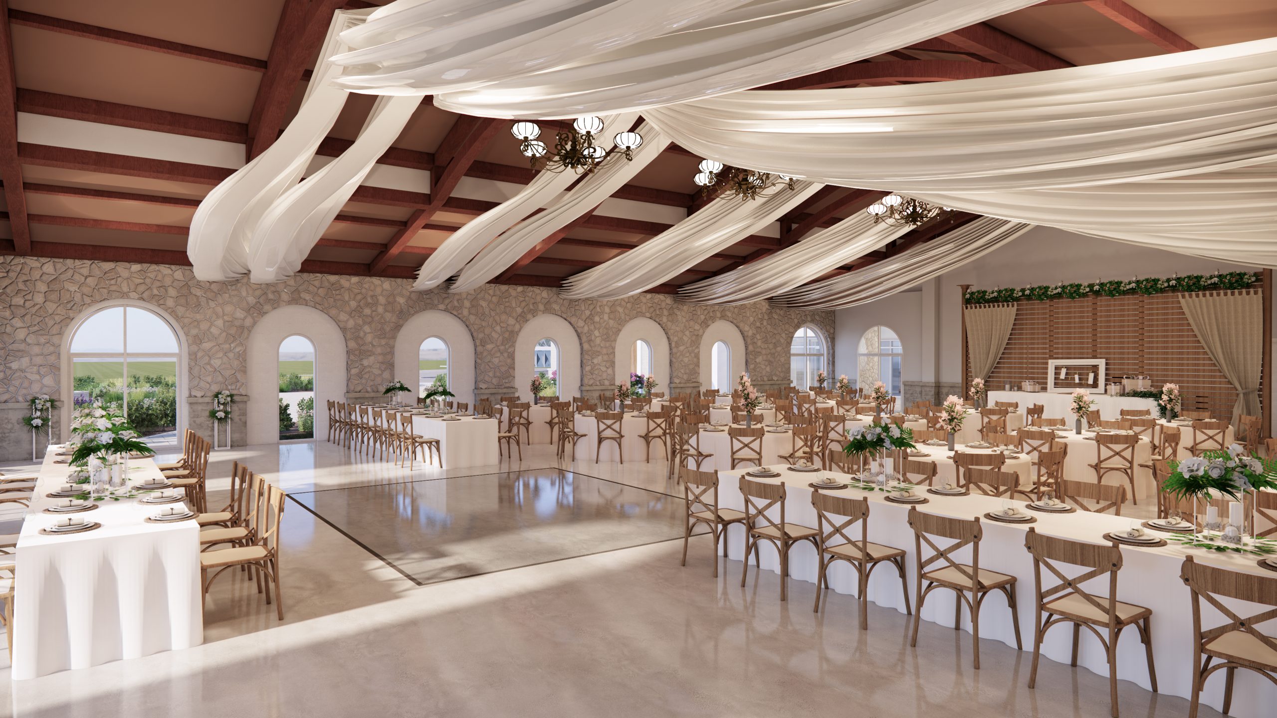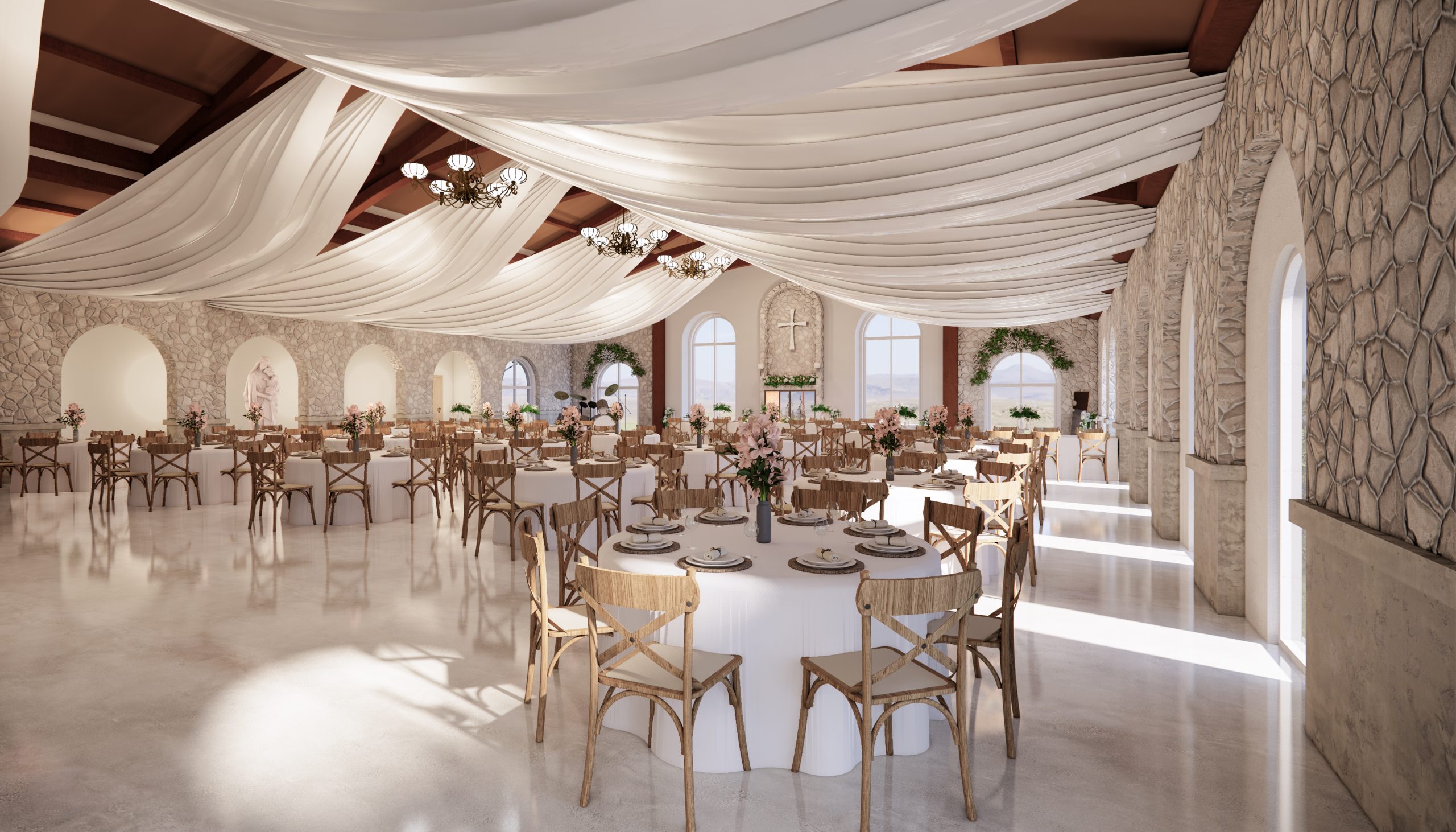 İç mekan kararlarına geldiğinde, öncelik, esnek kullanımları karşılayabilecek geniş bir salon düzeni tasarlamaktı. Bu alana zengin bir iç mekan tasarımı, yüksek tavanlar ve güçlendirilmiş kemerler ile oluşturuldu. Mevcut hizmet alanları (mutfak ve tuvalet) korundu. Hizmet alanları ile ilişkili depolama alanları, bu alanlara yakın konumlandırıldı ve mutfak için ek depolama alanı önerildi. Çok amaçlı salonda etkinlikler için bir hazırlık odası, bu salona bir gelin ve damat odası olarak hizmet etmek ve diğer etkinliklerde bir konuşmacının hazırlık odası olarak hizmet etmek üzere tasarlandı. Son olarak, Pazar okulu, hem çok amaçlı salondan bir kemerli salon ile ayrılarak, hem de çok amaçlı salona bağlanabilen ve dış girişe sahip olabilen bir şekilde konumlandırıldı.