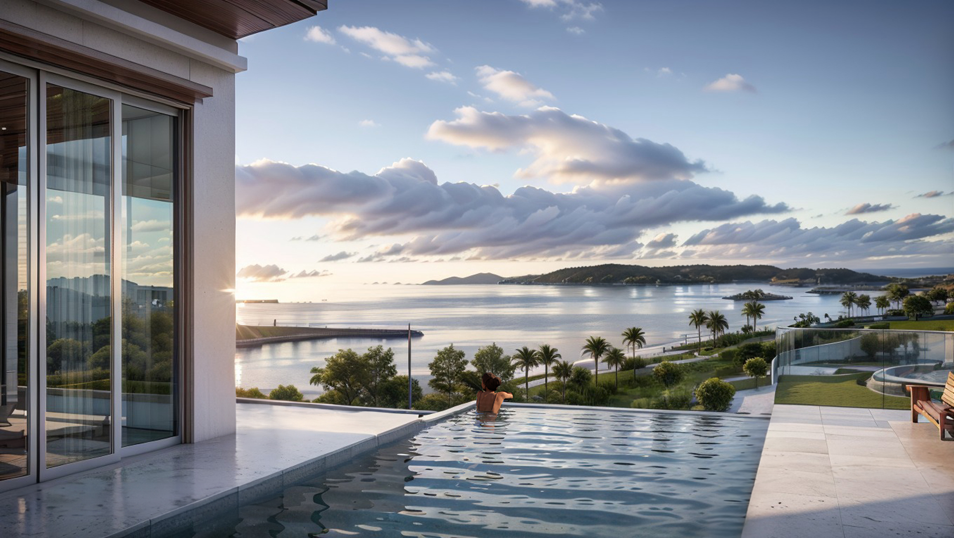 Sonsuzluk havuzu, mekânın en dikkat çekici özelliklerinden biri olarak konumlandırılmıştır. Üst katta yer alan bu özel havuz, deniz manzarasının sakinleştirici etkisiyle bütünleşmektedir. Havuzun kenarında yer alan zen duvarı, misafirlere dinlendirici bir ortam sunmakta ve benzersiz bir deneyim yaşamalarını sağlamaktadır. Bu özel tasarım kararı, mekânda huzurlu bir atmosfer yaratmak için titizlikle düşünülmüştür.