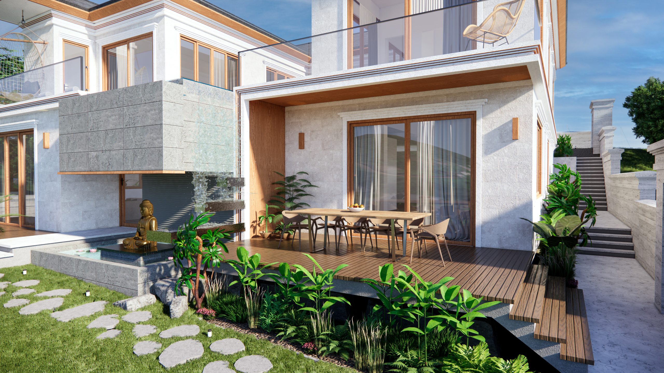 Bu proje kapsamında, peyzaj çalışmaları doğal çevrenin özelliklerini koruyarak ve vurgulayarak gerçekleştirildi. Bitki örtüsü, taş döşeme ve su öğeleri gibi unsurlar, mekânın Bali tarzını yansıtan sıcak ve davetkar bir atmosfer oluşturmak için kullanıldı. Ayrıca, eğimli arazinin avantajları kullanılarak, farklı seviyelerdeki özellikler arasında uyumlu bir denge sağlandı.