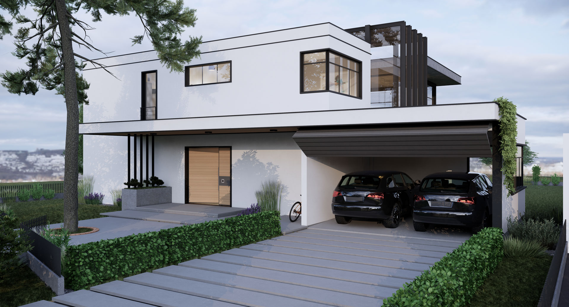 Berlin’in şehir merkezinden uzak, sakin bir kasabada yer alan bu müstakil konut projesi, yönetmen ve yoga eğitmeni olan bir çift için özel olarak tasarlanmıştır. Proje, yalın bir cephe dilini benimsemiş ve doğayla iç içe bir yaşam deneyimi sunmayı hedeflemiştir. Brüt betondan oluşan yapı elemanları, cepheye vurgu yaparak modern ve endüstriyel bir estetik sunmaktadır. Giriş cephesi daha sağır bir görünüme sahiptir ve tamamen arka bahçeye açılan geniş pencerelerle zıtlık oluşturarak doğayla bütünleşmeyi vurgular. Salon ve mutfak gibi ana yaşam alanları, bahçeye açılan geniş bir teras ile birbirine bağlanmıştır. Bu teras, doğayla iç içe bir yaşam deneyimi sunmakta ve sakin bir ortamda dinlenme ve sosyalleşme imkânı sağlamaktadır. Konutun tasarımında minimalizm ve doğal malzemeler ön planda tutulmuş, böylece mütevazi bir yaşam ortamı yaratılmıştır.