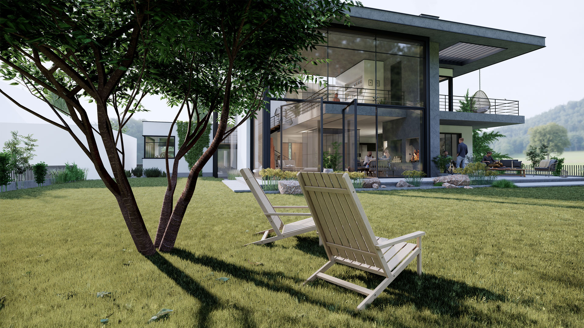 Berlin’in şehir merkezinden uzak, sakin bir kasabada yer alan bu müstakil konut projesi, yönetmen ve yoga eğitmeni olan bir çift için özel olarak tasarlanmıştır. Proje, yalın bir cephe dilini benimsemiş ve doğayla iç içe bir yaşam deneyimi sunmayı hedeflemiştir. Brüt betondan oluşan yapı elemanları, cepheye vurgu yaparak modern ve endüstriyel bir estetik sunmaktadır. Giriş cephesi daha sağır bir görünüme sahiptir ve tamamen arka bahçeye açılan geniş pencerelerle zıtlık oluşturarak doğayla bütünleşmeyi vurgular. Salon ve mutfak gibi ana yaşam alanları, bahçeye açılan geniş bir teras ile birbirine bağlanmıştır. Bu teras, doğayla iç içe bir yaşam deneyimi sunmakta ve sakin bir ortamda dinlenme ve sosyalleşme imkânı sağlamaktadır. Konutun tasarımında minimalizm ve doğal malzemeler ön planda tutulmuş, böylece mütevazi bir yaşam ortamı yaratılmıştır.