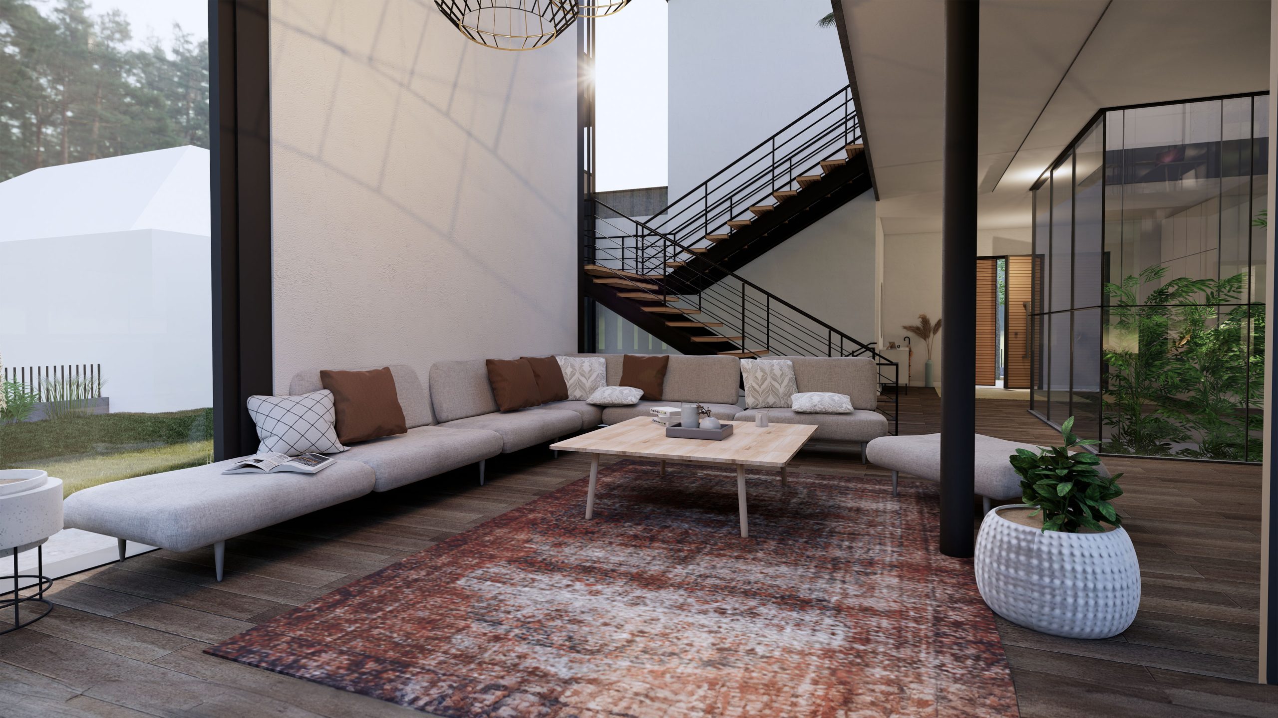 Bu açık plan konseptiyle tasarlanan evde, merdivenler, oturma alanı, iç bahçe, yemek odası ve mutfak gibi alanlar birbiriyle kesintisiz bir şekilde bütünleşmiştir. Cephenin büyük bir bölümü camdan oluştuğu için, sokaktan içeriye ilk adım atıldığında bile bahçe, mekânın organik bir parçası gibi hissedilir. Bu sayede, iç ve dış mekân arasında akıcı bir geçiş sağlanır ve doğal ışık, manzara ve yeşil alanlar evin içine taşınır. Ayrıca, yaşam alanının belirgin bir kısmı, çift kat yüksekliğinde bir galeriye dönüşerek daha ferah bir atmosfer oluşturur. Bu galeri, evin genel hacmini arttırırken, iç mekânın büyüklüğünü ve açıklığını vurgular. Böylece, konut sakinleri hem estetik bir deneyim yaşarlar hem de fonksiyonel olarak daha geniş ve rahat bir yaşam alanına sahip olurlar. İç mekânda, doğal malzemelerin sade ve doğal formları yoğun bir şekilde tercih edilmiştir. Bu malzemelerin dokuları özellikle vurgulanmış, genel olarak monokrom bir stil benimsenmiş ve renkli aksesuarlarla zenginleştirilmiştir. Bu tasarım yaklaşımıyla, iç mekânın karakteri sade, dingin ve doğal bir estetikle bütünleşmiş, malzemelerin kendine özgü karakterleriyle mekânın atmosferi zenginleştirilmiştir.